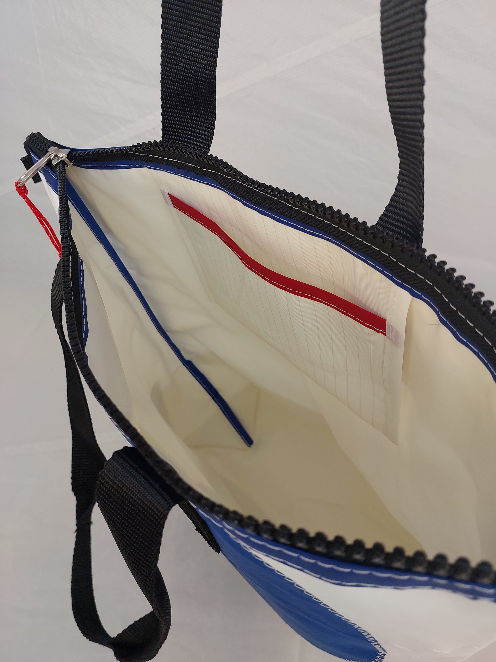 A white dacron sail with a white polyester lining. Featuring sailmaker webbing handles, dacron tape trim and an internal slip pocket. We only use the best YKK marine zip.