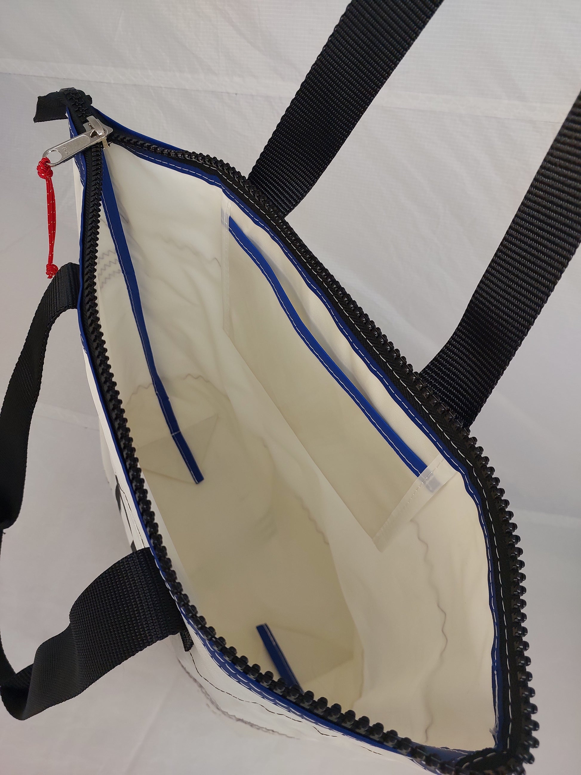 A white dacron sail with a white polyester lining. Featuring sailmaker webbing handles, dacron tape trim and an internal slip pocket. We only use the best YKK marine zip.