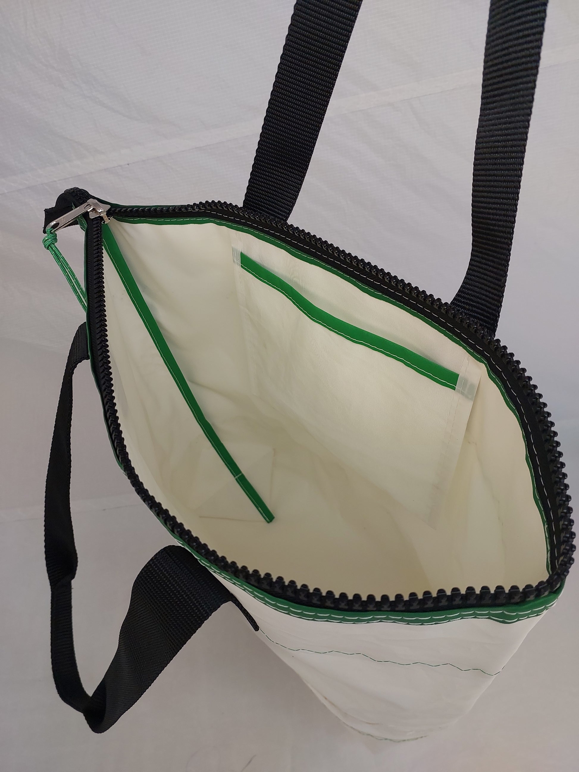 A white dacron sail with white polyester lining. Featuring sailmaker webbing handles, dacron tape trim and an internal slip pocket. We only use the best YKK marine zip.