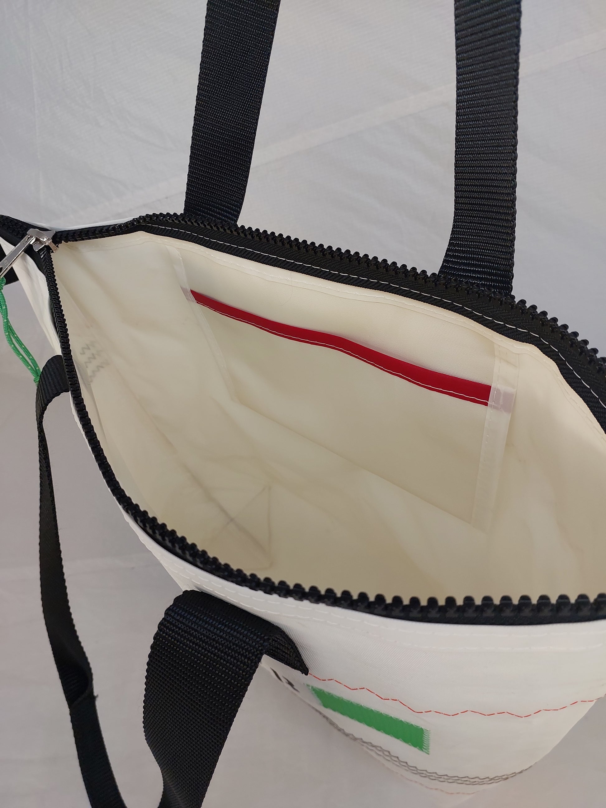 A white dacron sail with white polyester lining. Featuring sailmaker webbing handles, dacron tape trim and an internal slip pocket. We only use the best YKK marine zip.