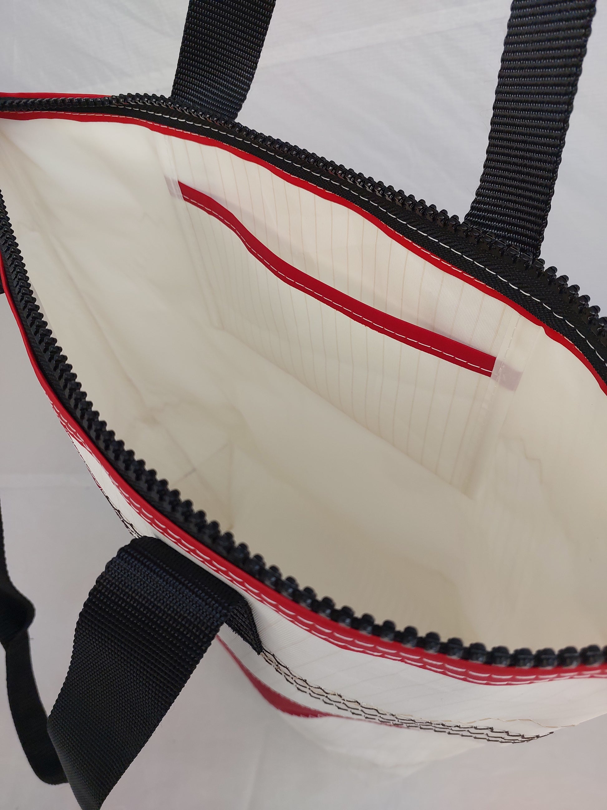 A white dacron sail with a tan pin stripe and a white polyester lining. Featuring sailmaker webbing handles, dacron tape trim and an internal slip pocket. We only use the best YKK marine zip.