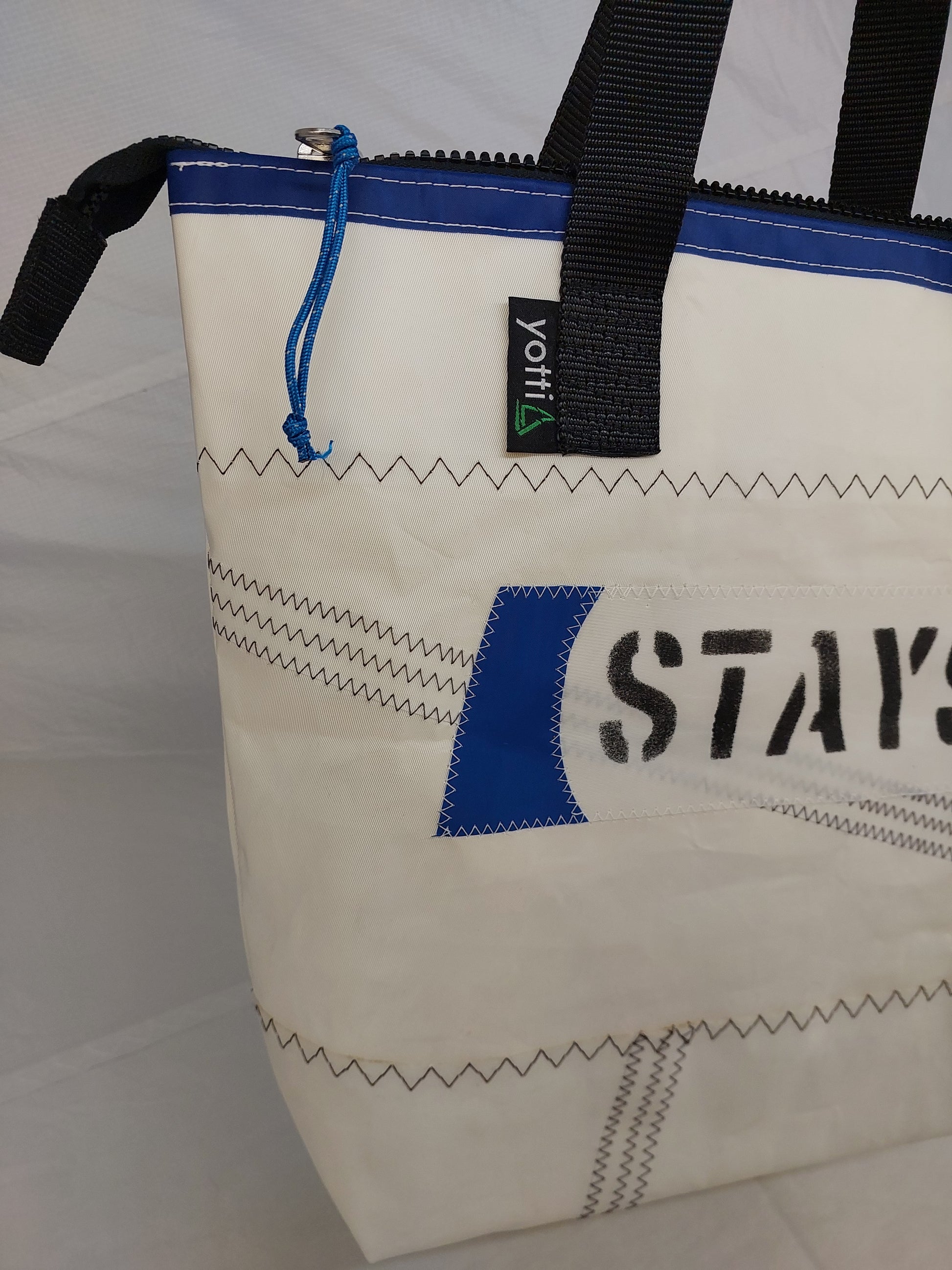 A white dacron sail with a yellow polyester lining. Featuring sailmaker webbing handles, dacron tape trim and an internal slip pocket. We only use the best YKK marine zip.