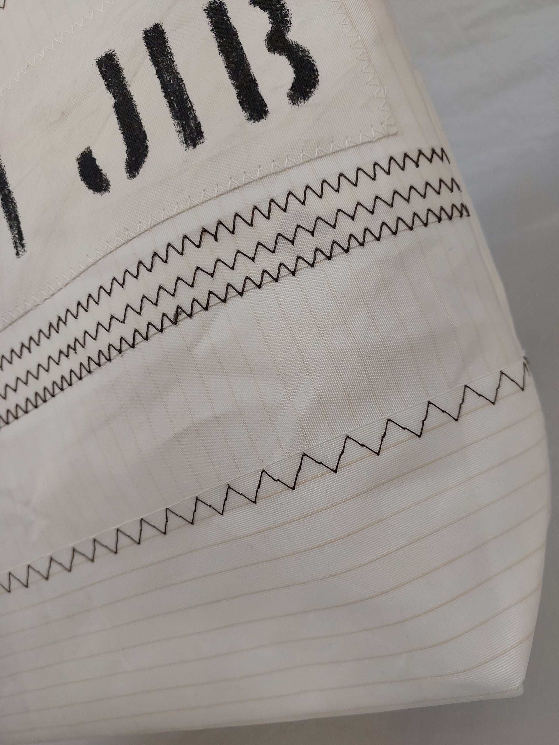 A white dacron sail with a tan pin stripe and a white polyester lining. Featuring sailmaker webbing handles, dacron tape trim and an internal slip pocket. We only use the best YKK marine zip.