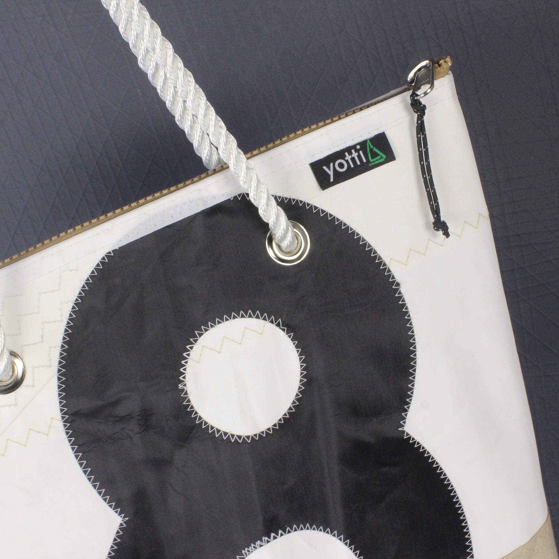 A Dacron sail fabric with a tan canvas base and lined with white polyester. Featuring traditional three strand rope handles, dacron tape trim and an internal slip pocket.