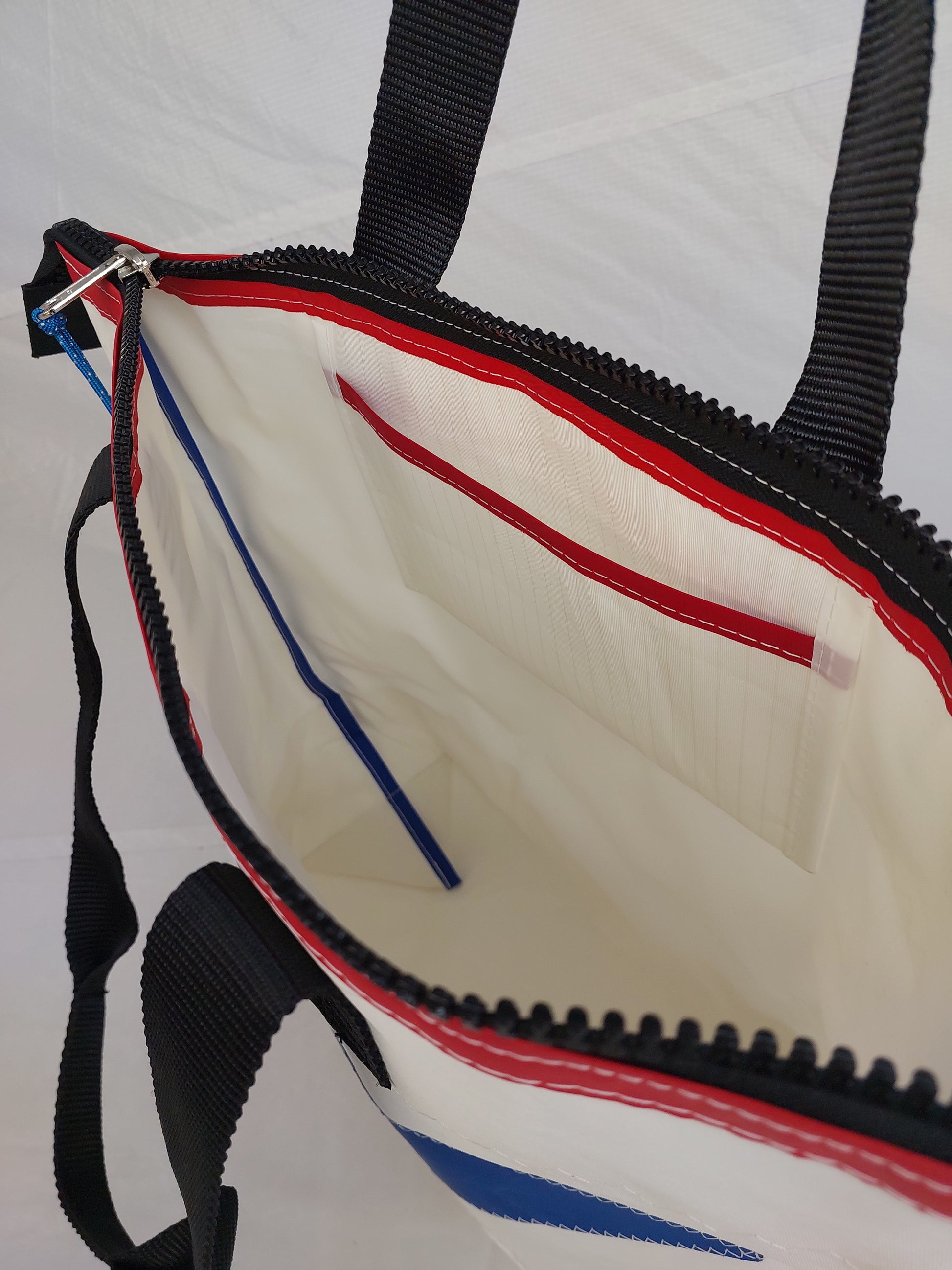 A white dacron sail with a white polyester lining Featuring sailmaker webbing handles, dacron tape trim and an internal slip pocket. We only use the best YKK marine zip.