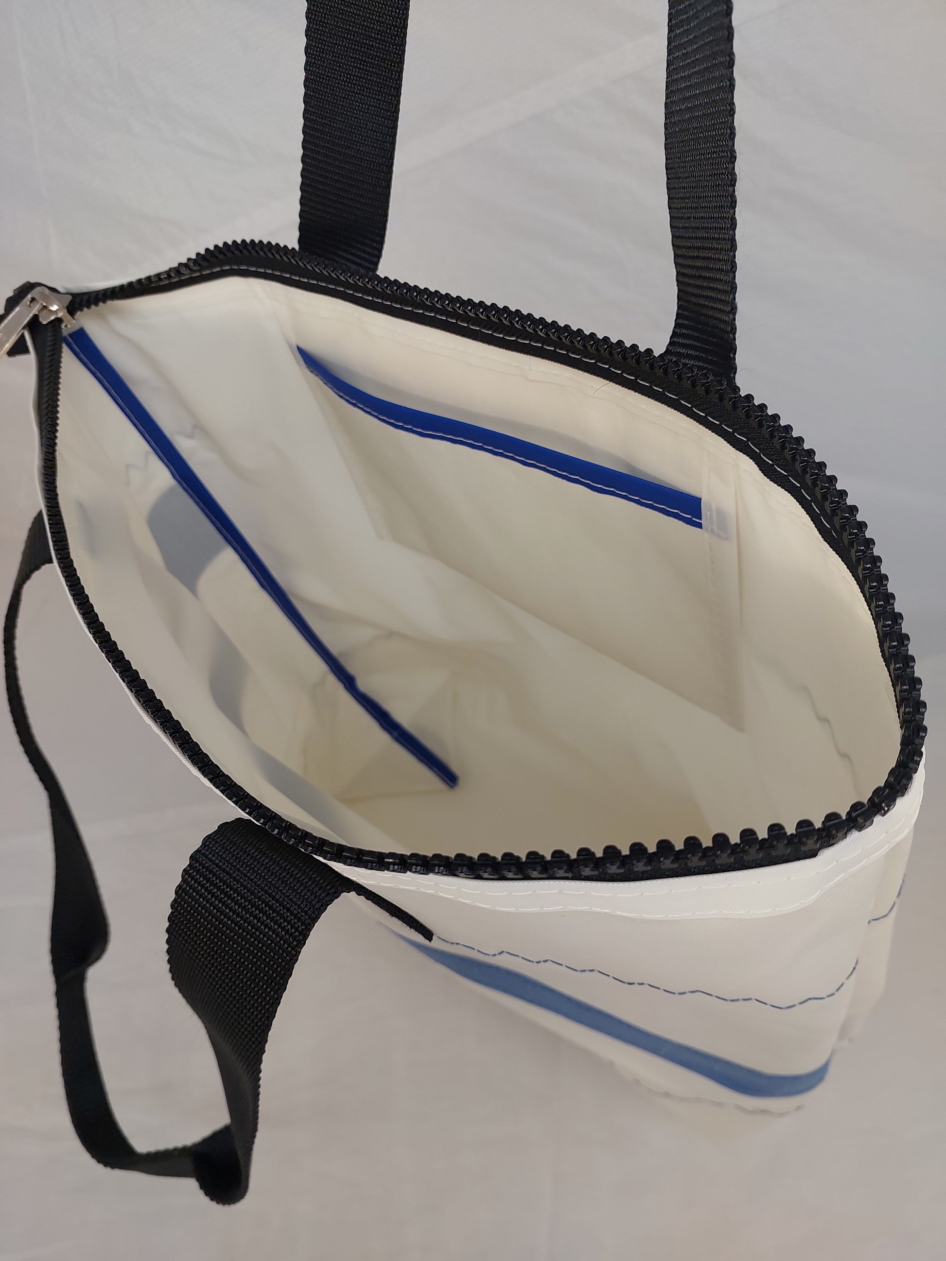 A white dacron sail with white polyester lining. Featuring sailmaker webbing handles, dacron tape trim and an internal slip pocket. We only use the best YKK marine zip.
