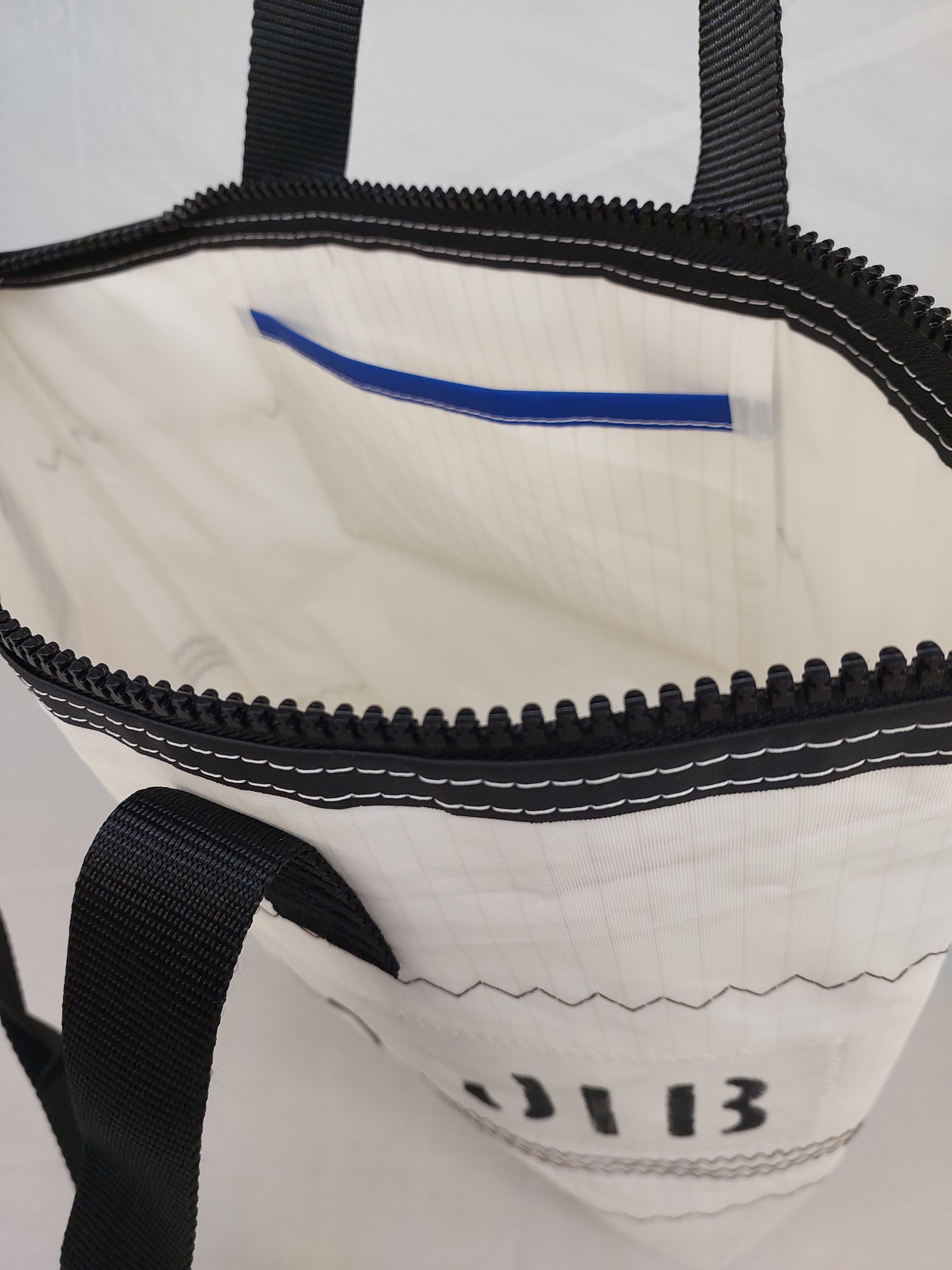 A white dacron sail with a tan pin stripe and a white polyester lining. Featuring sailmaker webbing handles, dacron tape trim and an internal slip pocket. We only use the best YKK marine zip.